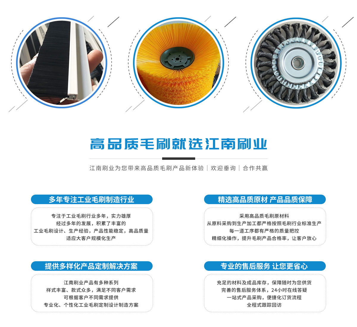 - 潛山江南刷業(yè)有限公司專(zhuān)業(yè)生產(chǎn)各類(lèi)涂油滾&膠輥&海綿滾&不織布輥、密封刷&鋼刷式密封、輸送帶刷式清掃器&牛體刷、鋼絲刷條&鋼絲板刷、PVC毛刷板&尼龍毛刷條、打孔鋁針輥&打孔銅針輥、圓形滾刷毛刷輥系列、圓形鋼刷&鋼絲刷輥、拋光毛刺磨料刷、試管刷&管道刷等各類(lèi)刷制品。江南刷業(yè)注重企業(yè)文化建設(shè),堅(jiān)持以人為本、以文化興司,大力培育和弘揚(yáng)“團(tuán)結(jié)、忠誠(chéng)、務(wù)實(shí)、創(chuàng)新”的企業(yè)精神、“專(zhuān)業(yè)鑄就品質(zhì)創(chuàng)新決定未來(lái)”的企...