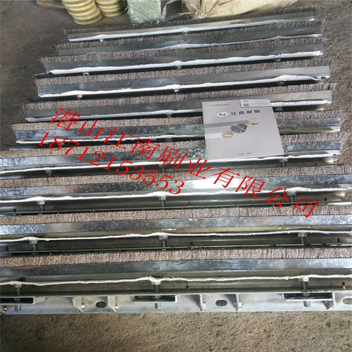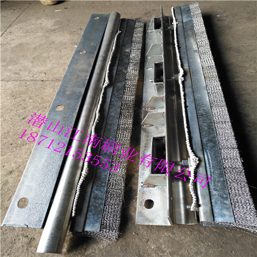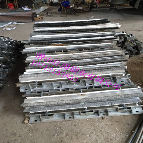 燒結(jié)球團環(huán)冷機漏風(fēng)問題:1對于煙罩問題目前采用耐熱輸送帶或石棉布接觸臺車欄板,但耐熱輸送帶經(jīng)常出現(xiàn)燒毀現(xiàn)象,石棉布雖然耐溫,使用時間長后,出現(xiàn)老化斷裂現(xiàn)象,我們設(shè)計了一種有彈性和韌性的高溫鋼刷密封,煙罩倆側(cè)采用高溫鋼刷與欄板接觸,防止冷風(fēng)竄入。小塊燒結(jié)礦可從鋼刷中通過。當(dāng)有大塊燒結(jié)礦時,鉸鏈?zhǔn)矫芊獍逄鹜ㄟ^。 2臺車橫梁密封,車輪與橫梁經(jīng)過V字型卸料溝后,橫梁逐漸接近臺車體,為防止快聊卡在中間。橫梁與臺車采用一定的間隙。我們也采用高彈性韌性鋼刷加磁鐵密封,代替原有橡膠密封。 3底部密封,底部采用柔磁性鋼刷密封,高彈韌性鋼刷加磁鐵裝置,使用時撒上精礦粉,與上下滑到精密接觸,但是倆個部分高增加寬度防止跑偏現(xiàn)象發(fā)生。增加密封效果。