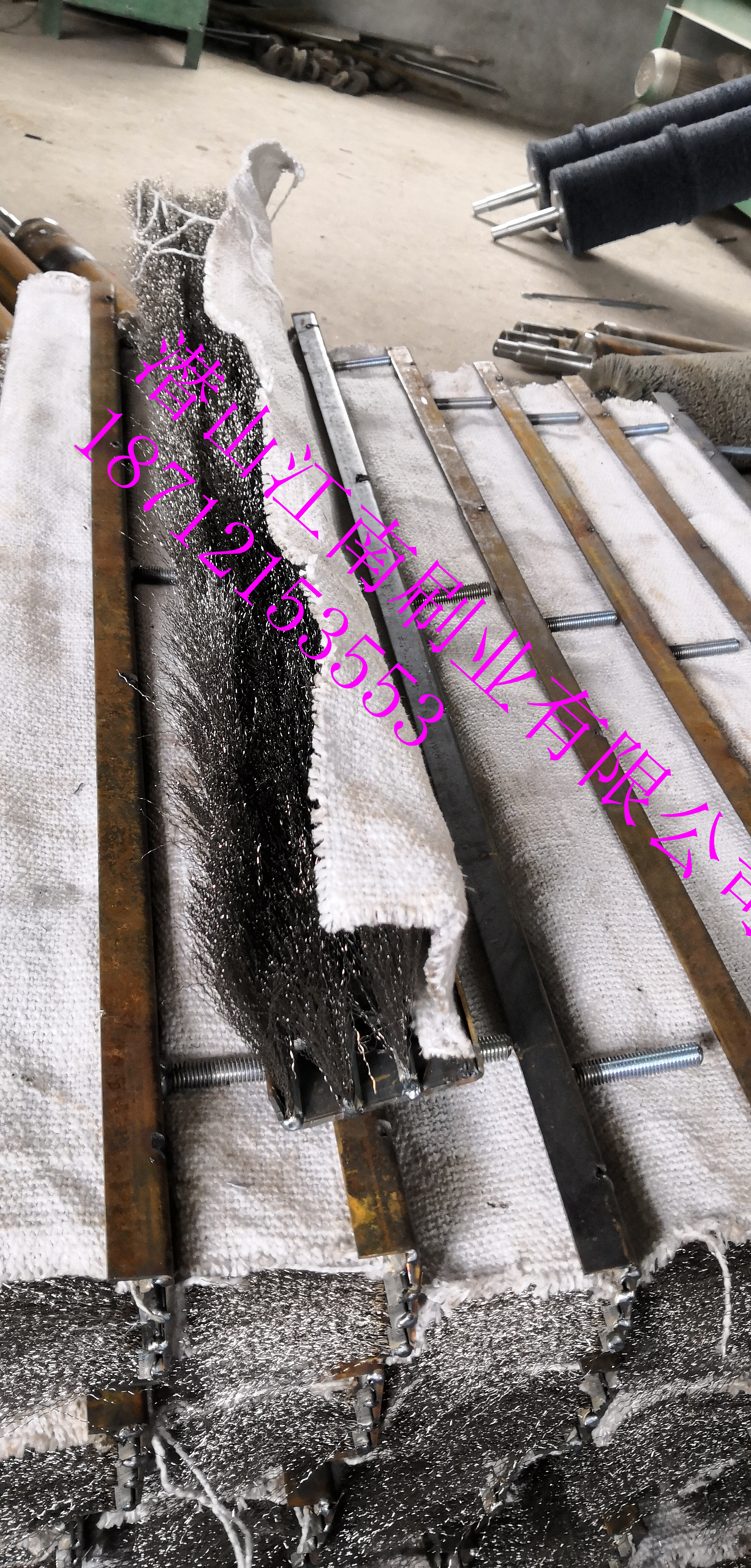 車輪與橫梁經(jīng)過V字型卸料溝后,橫梁逐漸接近臺車體,為防止塊料卡在中間,橫梁與臺車體之間有一定的間隙,間隙用鋼刷式密封代替原橡膠密封。該結(jié)構(gòu)采用密集的耐溫耐磨鋼刷制作,外面帶有磁性物質(zhì),生產(chǎn)運行中,鋼刷吸附鐵粉粒呈圓束狀在外層更好地進行密封,見圖3。