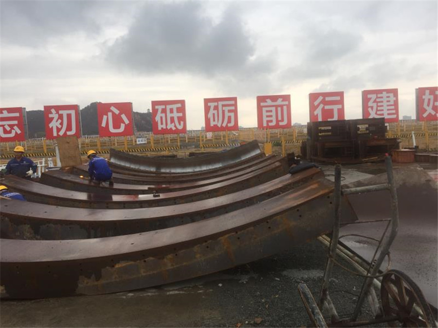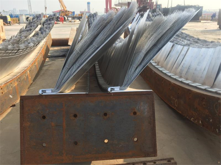 利用管片安裝機將事先準備好的長度800mm的16個撐墊安放于管片與推進油缸之間,手動將每個油缸都抵緊撐墊,利用推進油缸向前頂推盾構(gòu)掘進700mm,此時露出兩道盾尾刷; 露出兩道盾尾刷示意圖 16個撐墊布置示意圖 (4)移動并伸出管片安裝機抓舉頭,將點位①處的撐墊固定在安裝機上,縮回點位①處的推進油缸,拆除點位①的撐墊,同理拆除點位②的撐墊; (5)將密封刷及溝槽上的油脂、砂漿等干凈,再開始割除尾刷。然后將尾刷割除的***打磨平整,再開始焊接新的密封刷。焊完后,在新密封刷上涂抹盾尾密封油脂; (6)利用管片安裝機安裝點位處的撐墊,將點位①和②處的推進油缸將點位①和②處的撐墊頂緊,然后拆除點位③和④處的撐墊; (7)重復步驟(5),更換新的密封刷,然后按照上述步驟順次更換其余密封刷(每次只拆除相鄰兩個點位的撐墊) 盾尾密封刷技術(shù)標準 1、保護板采用SAE1566彈簧鋼,前保護板為雙層,1.0加0.5,后保護板為2片1.0加強型,采用特殊工藝(專用壓模)熱處理HRC45-47.確保彈性和耐磨性, 鋼絲刷刷絲采用¢0.3直徑不銹鋼絲,確保彈性,不生銹、不斷裂。 2、銷釘采用低碳鋼(Q345),確保焊接性能和耐磨。 3、尾刷中間絲網(wǎng)采用40目高密度不銹鋼材質(zhì)。 4、上蓋板,底座板,采用Q235。 5、總裝采用專用工夾具和20T專用液壓機疊加擠壓工藝進行總裝 6、焊接工藝采用專用二氧化碳氣體保護焊接. 7、成品保護板熱處理后,,抽檢不低于10%采用20T液壓機連續(xù)500次沖壓確保產(chǎn)品變形度小于2.5度 8、組裝后的盾尾刷其鋼絲應有雙曲且整齊無亂絲,斷絲,鋼板光滑無毛邊,兩側(cè)面平整無細絲外露,產(chǎn)品表面做防銹處理,每個成品凈重控制在正負0.1公斤。